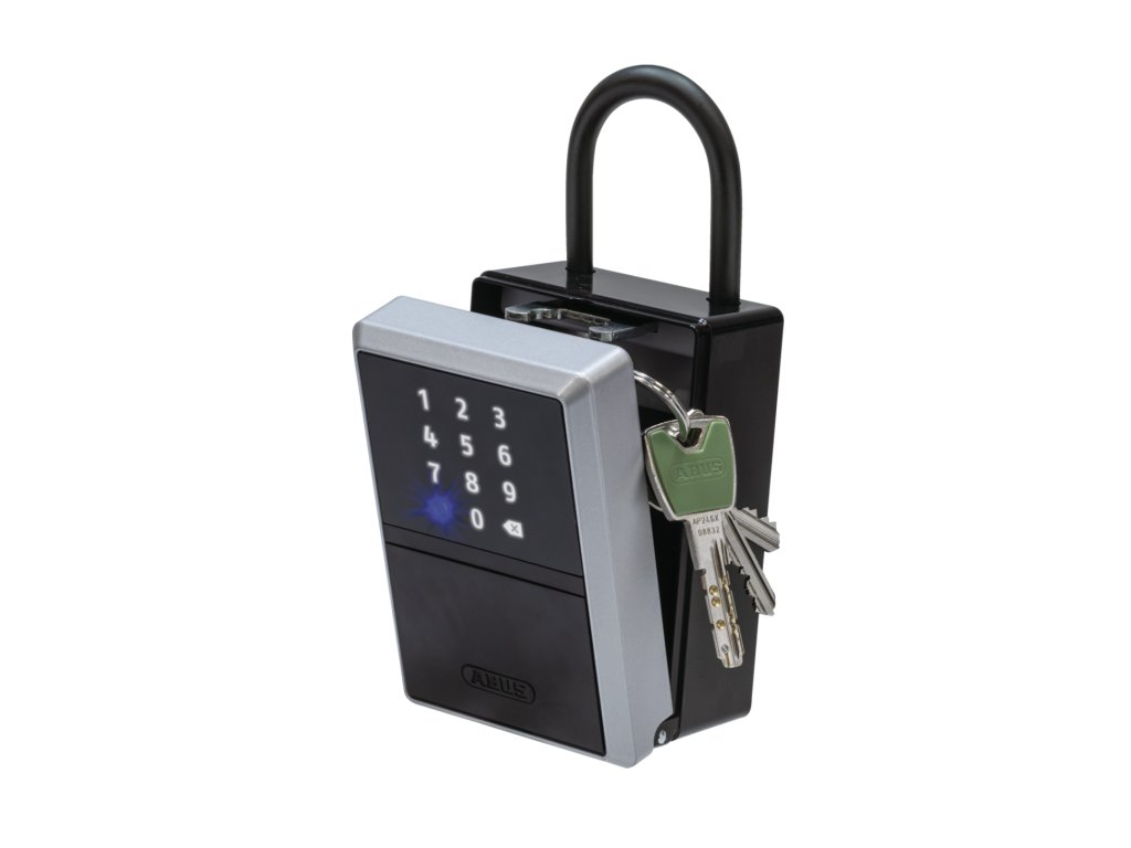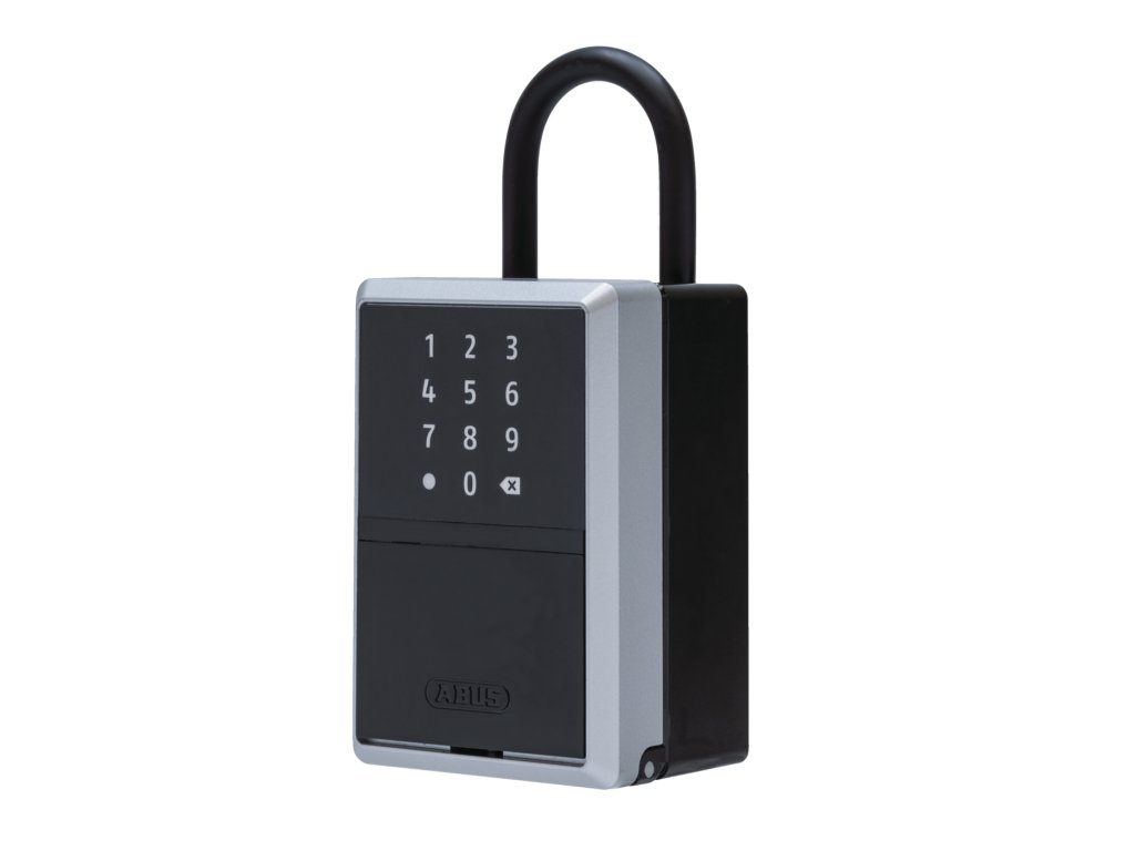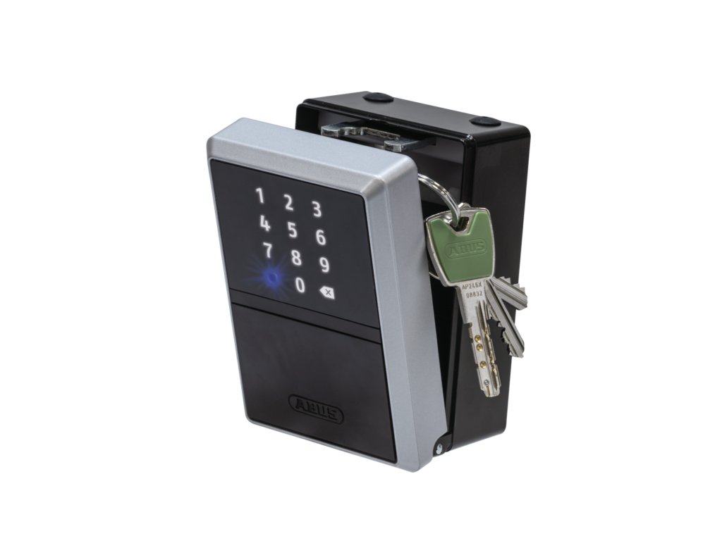 Chytrá schránka na klíče, Bluetooth, napájení 2× AA bateriemi, zadání šestimístného PIN kódu přes LED podsvícený číselník, možnost elektronické vstupenky přes aplikaci ABUS One, správa přístupů a historie, kapacita až 20 klíčů, varianta na zavěšení i montáž na zeď, černé/stříbrné provedení.