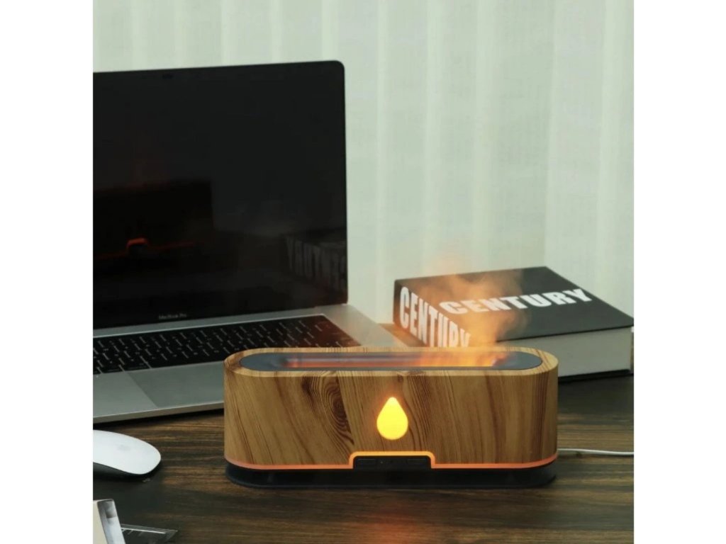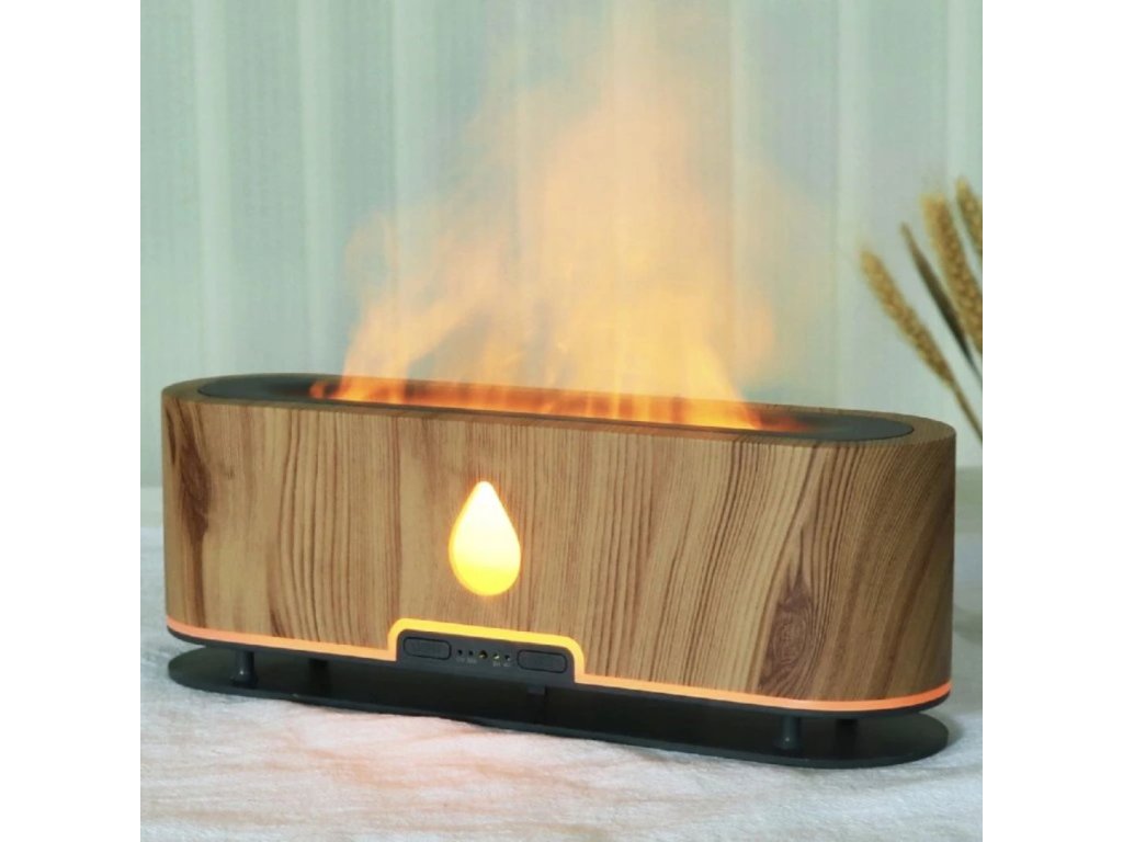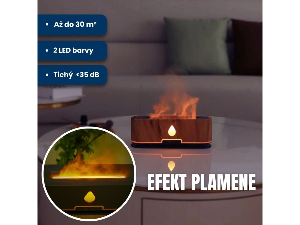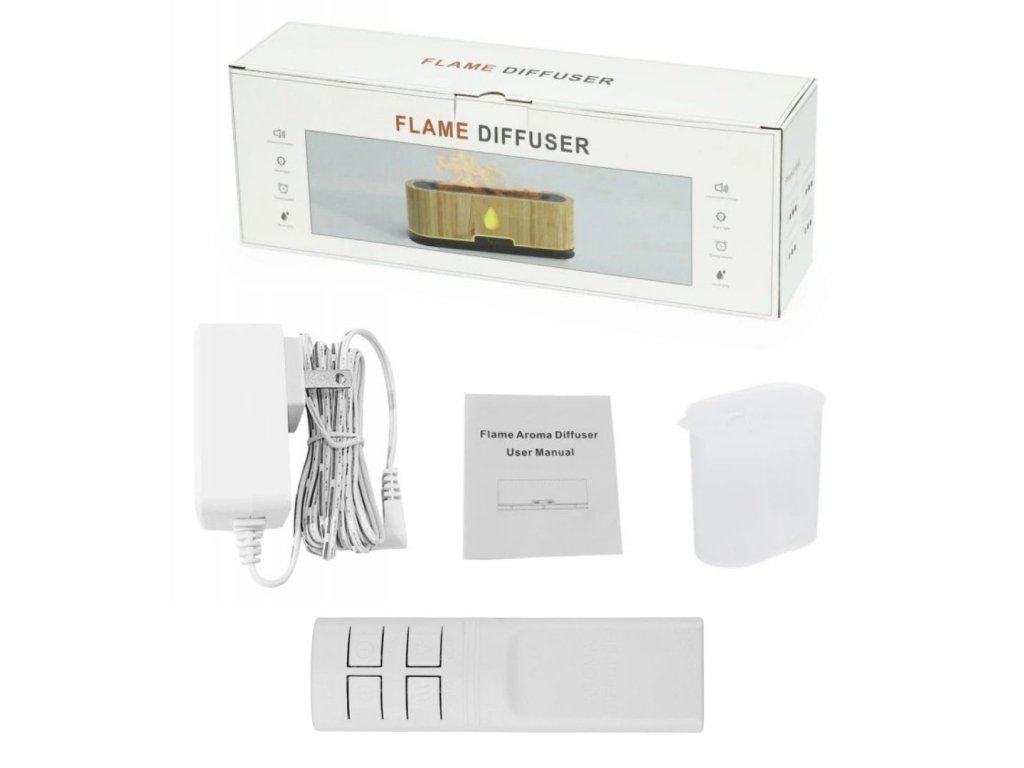 Aroma difuzér, objem nádoby 200 ml, 2 barevné podsvícení, imitace plamene, doba provozu 12 hodin, dálkové ovládání, barva bílá, tmavě hnědé dřevo a světle hnědé dřevo.