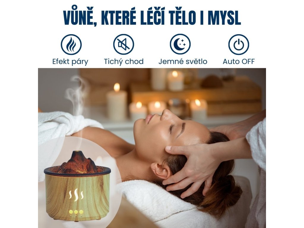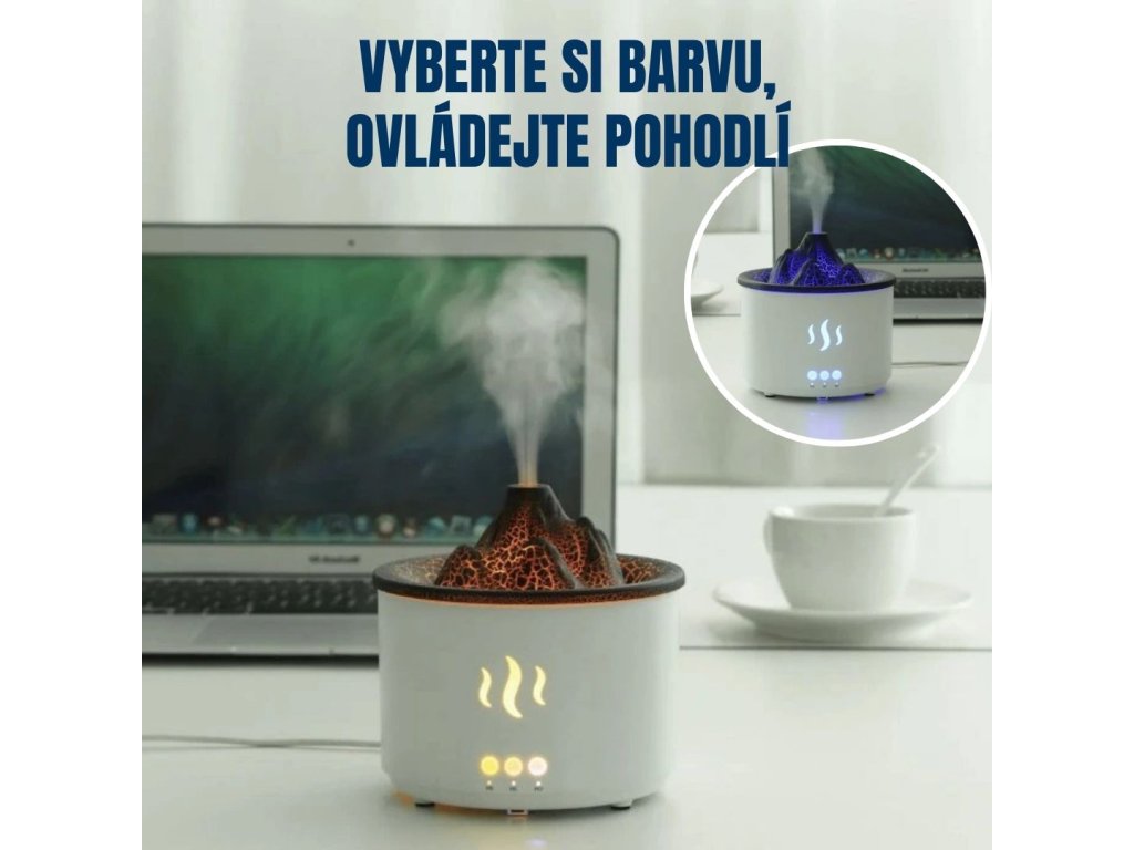 Tlačítky ovládaný aroma difuzér, objem nádoby260 ml, barevné podsvícení, imitace sopky, doba provozu 12 hodin, barva bílá a světle hnědé dřevo.