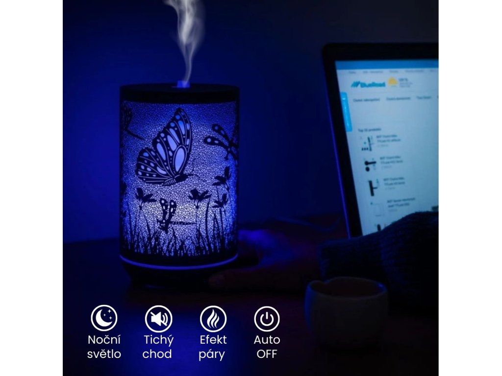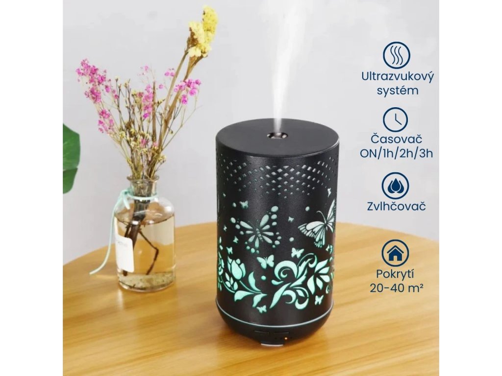 tlačítky ovládaný aroma difuzér, objem nádoby 300 ml, 7 barev podsvícení, doba provozu 12 hodin, podsvícení, materiál kov, motiv motýlí louka, barva černá