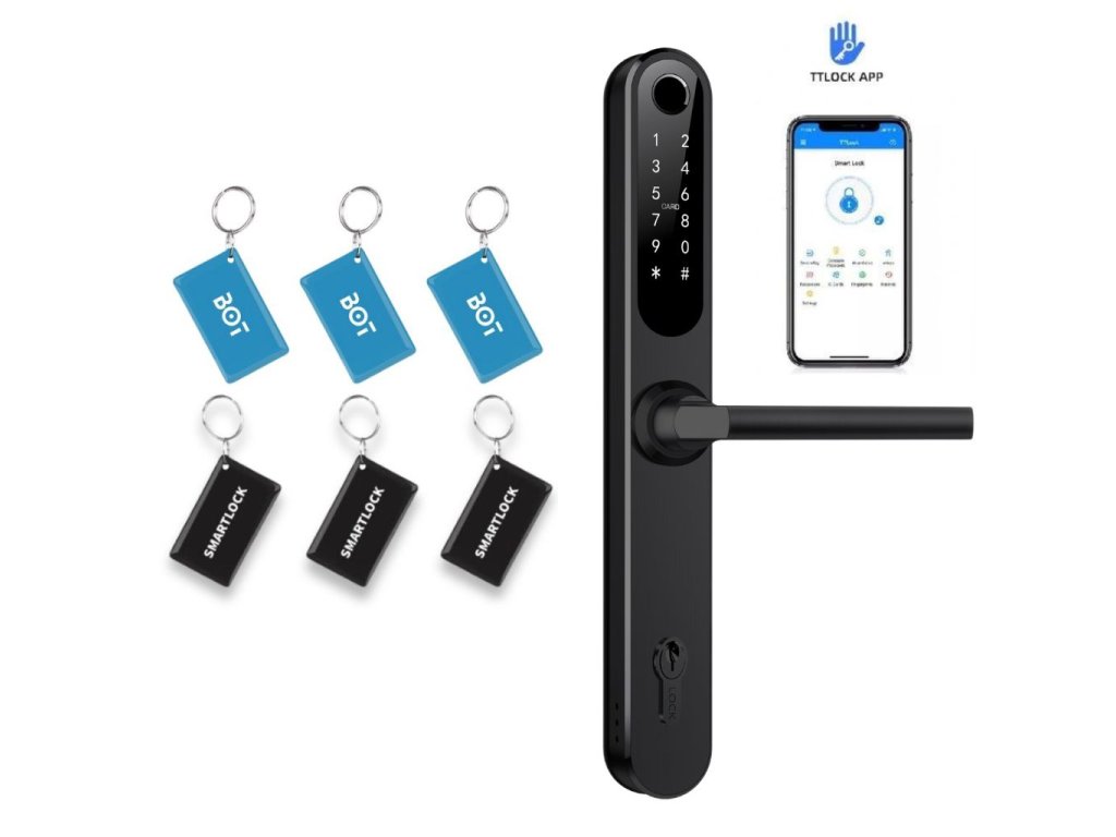 Bluetooth / WiFi chytrá klika, vhodná pro interiérové i exteriérové použití, ovládání přes aplikaci TTlock, 8 možností odemykání (klíč, otisk prstu, číselný kód, čipová karta, mobilní telefon, apple watch, hlasový asistenti nebo na dálku přes gateway), varianty na rozteč zámku 72 mm, 85 mm, 90 mm nebo 92 mm nebo bez cylindrické vložky, doporučená tloušťka dveří 35-75 mm (s prodlužovacím setem až 120 mm), možnost pravé i levé orientace, napájení bateriemi 4ks AA, černá