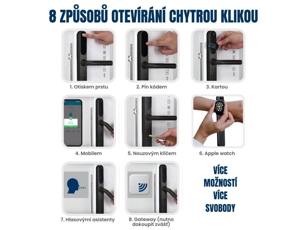 "U tolika způsobů, jak odemknout dveře, mám někdy problém se rozhodnout, který zvolit :D nejraději mám ale přes Wifi, tedy doporučuji dokoupit Wifi gateway. Produkt je spolehlivý a praktický. Doporučuji."