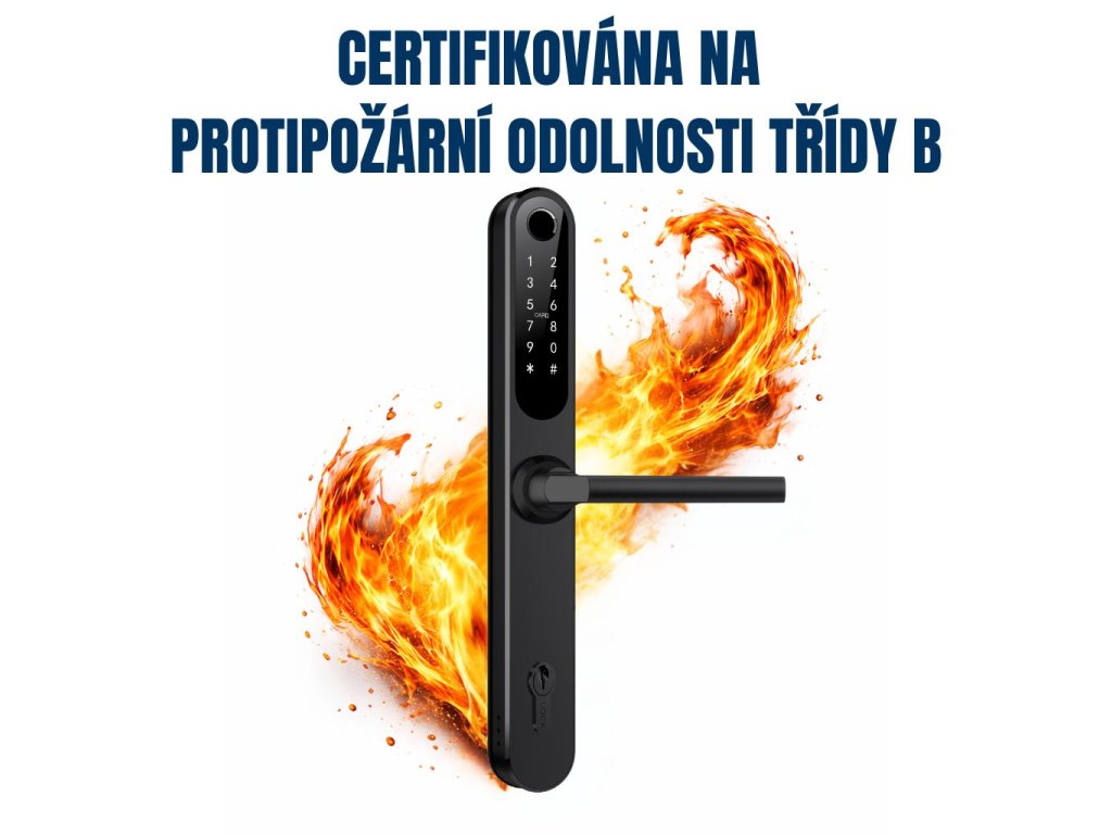 Ano, chytrá klika H1 byla testována v požární zkušební laboratoří a poté certifikována akreditovanou zkušebnou podle normy ČSN EN 16867+A2:2025, konkrétně v oblasti požární odolnosti (čl. 4.4). Výsledkem je klasifikace do protipožární třídy B, která umožňuje použití kliky na požárních dveřích a únikových cestách v souladu s platnou legislativou..