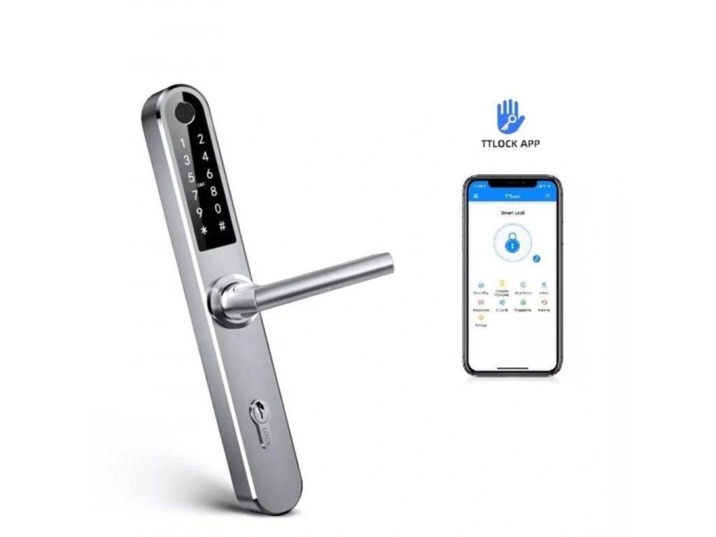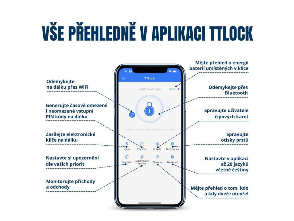 Bluetooth / WiFi chytrá klika, integrovaná čeština, extra odolná, vhodná pro vnitřní i venkovní dveře, ovládání přes aplikaci TTLock, doporučená tloušťka dveří 35-75 mm (s prodlužovacím setem až 120 mm), možnost pravé i levé orientace, sedí na 99 % dveří, napájení bateriemi, stříbrná