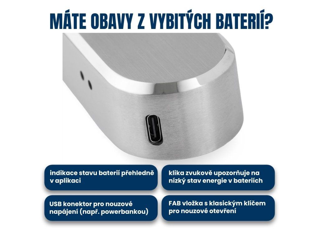 Při vybití lze kliku nouzově napájet přes USB (např. powerbankou)