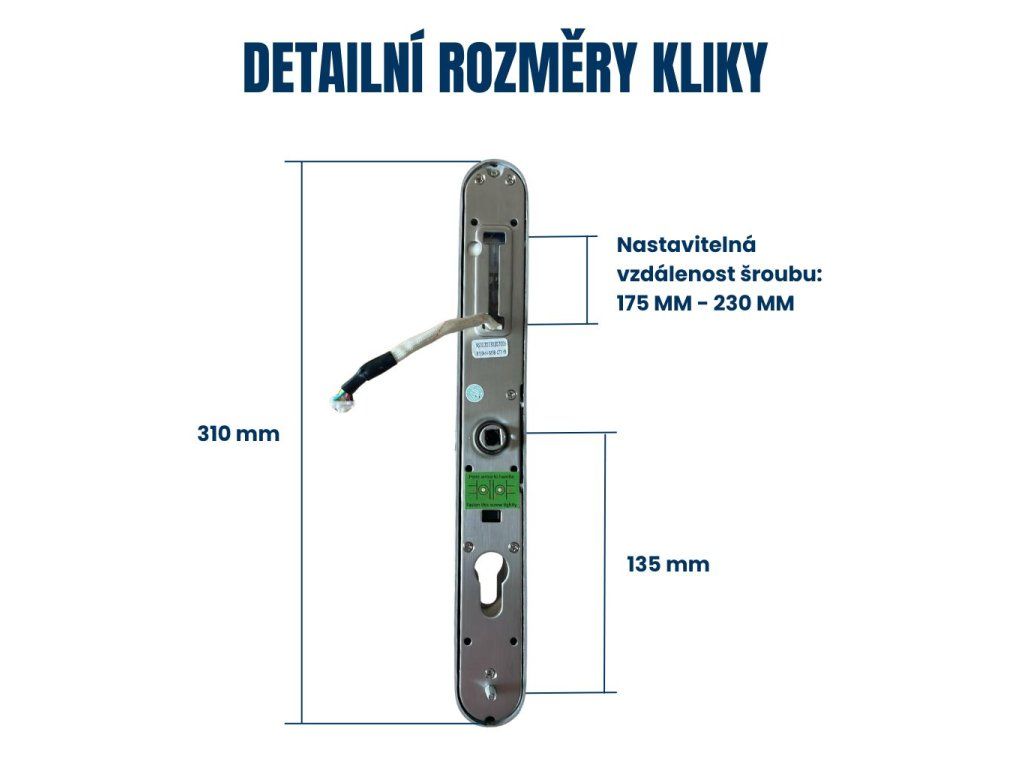 - ✔ Rozměry kliky: výška kliky 310 mm, šířky kliky (bez gumového těsnění) 38 mm, celková šířka kliky (s gumovým těsněním) 41 mm, délka madla 127 mm, rozteč šroubů a jejich vzálenost spodního šroubu od čtyřhranu: 135 mm, rozměr roztečí mezi šrouby: 175-230 mm