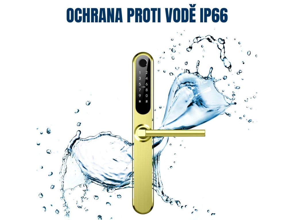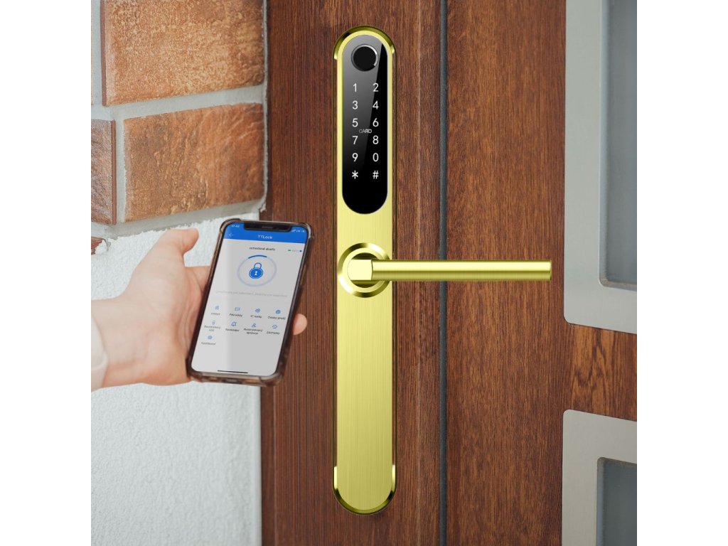 Bluetooth / WiFi chytrá klika, vhodná pro interiérové i exteriérové použití, ovládání přes aplikaci TTlock, 7 možností odemykání (otisk prstu, číselný kód, čipová karta, mobilní telefon), bez cylindrické vložky, doporučená tloušťka dveří 35-75 mm (s prodlužovacím setem až 120 mm), možnost pravé i levé orientace, napájení bateriemi 4ks AA, zlatá