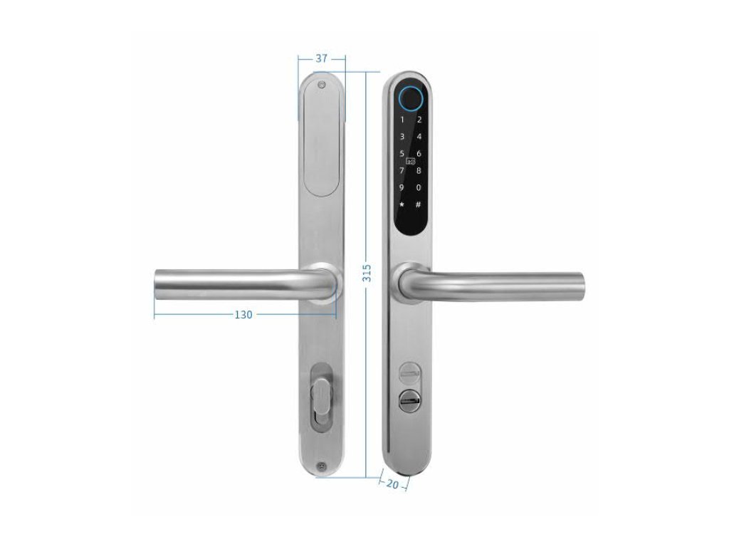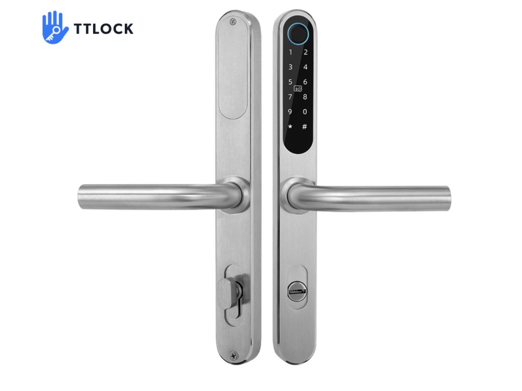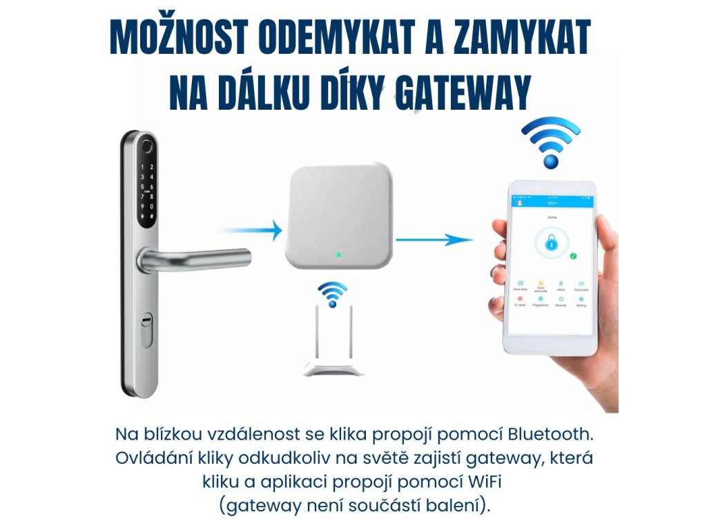 Bluetooth / WiFi chytrá klika, vhodná pro interiérové i exteriérové použití, ovládání přes aplikaci TTlock, 5 možností odemykání (klíč, otisk prstu, číselný kód, čipová karta, mobilní telefon), variabilní nastavení rozteče zámku 72 až 92mm, doporučená tloušťka dveří 40-120 mm, možnost pravé i levé orientace, napájení bateriemi 4ks AAA, stříbrná