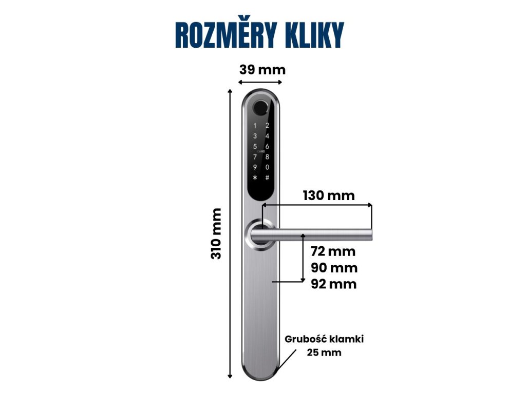 ZigBee / WiFi chytrá klika, vhodná pro interiérové i exteriérové použití, ovládání přes aplikaci Tuya, 4 možnosti odemykání (otisk prstu, číselný kód, čipová karta, mobilní telefon), bez otvoru na cylindrickou vložku, doporučená tloušťka dveří 35-75 mm (s prodlužovacím setem až 120 mm), možnost pravé i levé orientace, napájení bateriemi 4ks AA, stříbrná