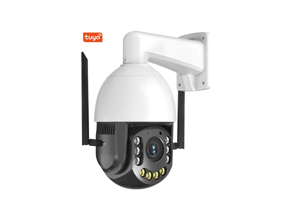 Chytrá venkovní bezpečnostní kamera, detekce pohybu, 5MP, rozlišení 2592x1944 px, 20x optický zoom, WiFi, ovládání natočení kamery horizontálně 0°-360° a vertikálně 0°-90°, oboustranná komunikace, mobilní aplikace Tuya Smart/Smart Life, materíál kov, bílé provedení.
