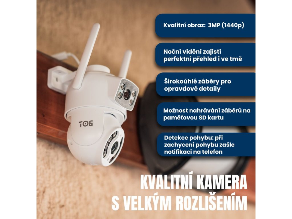 Chytrá venkovní bezpečnostní kamera, detekce pohybu, 3MP (1440p) WiFi, dva 3 Mpx snímače, zorné pole 355°, ovládání natočení kamery horizontálně 0°-355° a vertikálně 0°-90°, oboustranná komunikace, mobilní aplikace Tuya Smart/Smart Life, barva bílá.