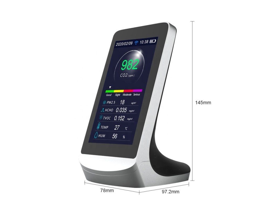 Chytrý monitor kvality vzduchu s teploměrem a vlhkoměrem, monitoruje CO2, TVOC, HCHO a PM2.5, WiFi 2,4 GhHz, mobilní aplikace Tuya Smart / Smart Life, LCD displej, vestavená dobíjecí baterie, černo-stříbrné provedení.