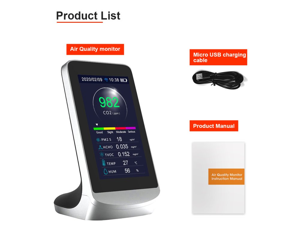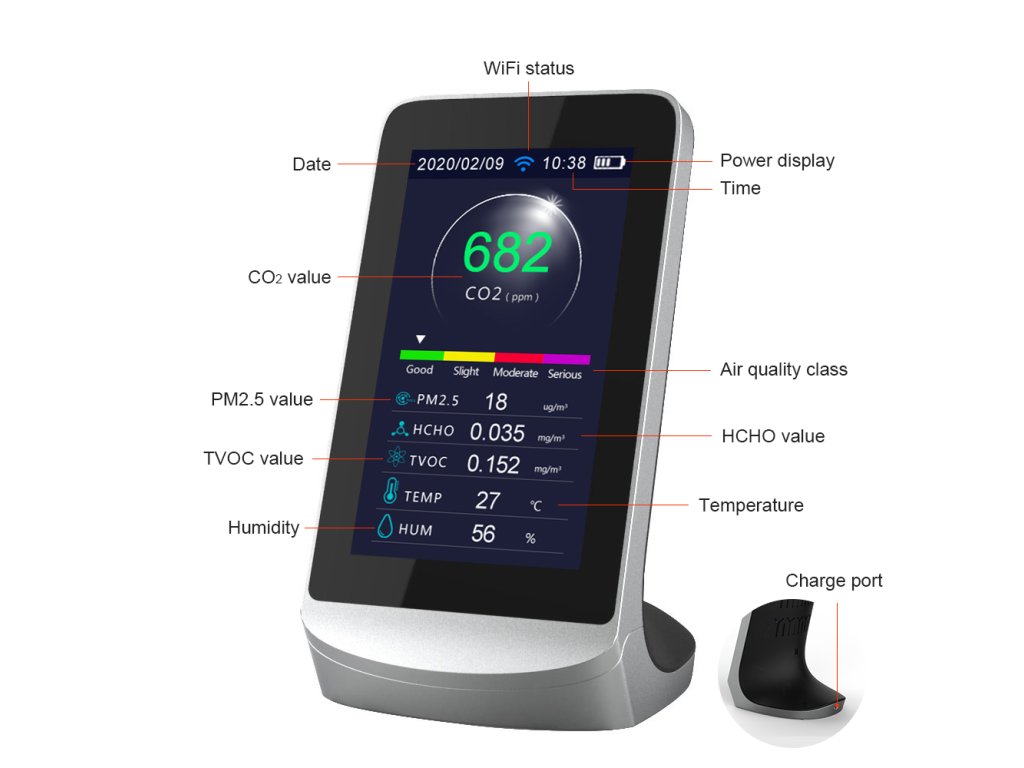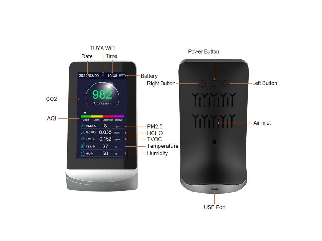- Měřené hodnoty: CO₂, PM2.5, PM1.0, PM10, AQI, HCHO, TVOC, teplota, vlhkost