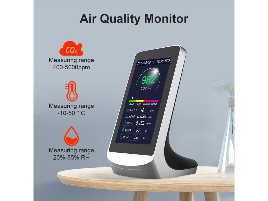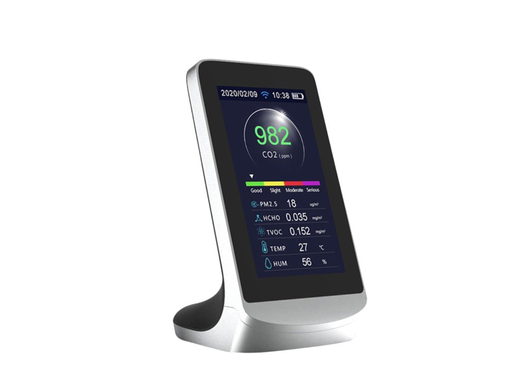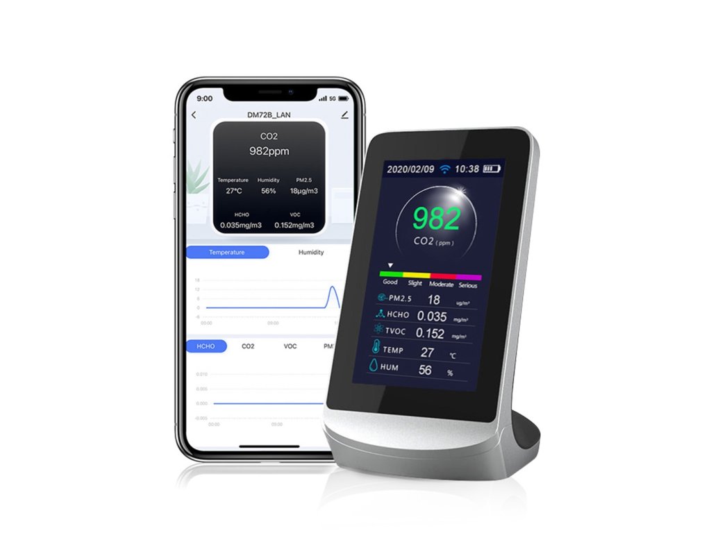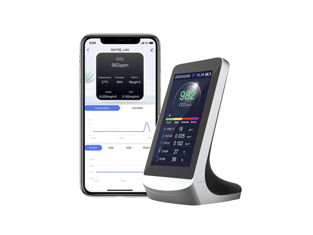 - Sleduje CO₂, prachové částice, formaldehyd, VOC, teplotu a vlhkost v reálném čase