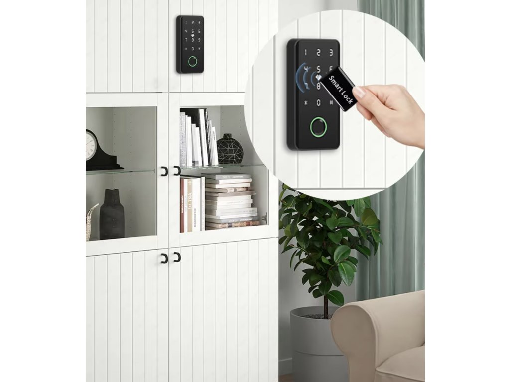 Chytrý zámek pro uzamykání nábytku, mobilní aplikace TTLock, WiFi, 4 způsoby odemykání (PIN, otisk prstu, IC karta, mobilním telefonem), napájení 4x AAA baterie, černé provedení.