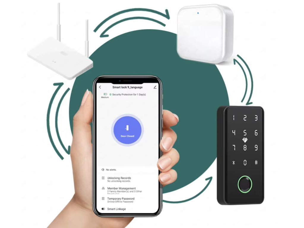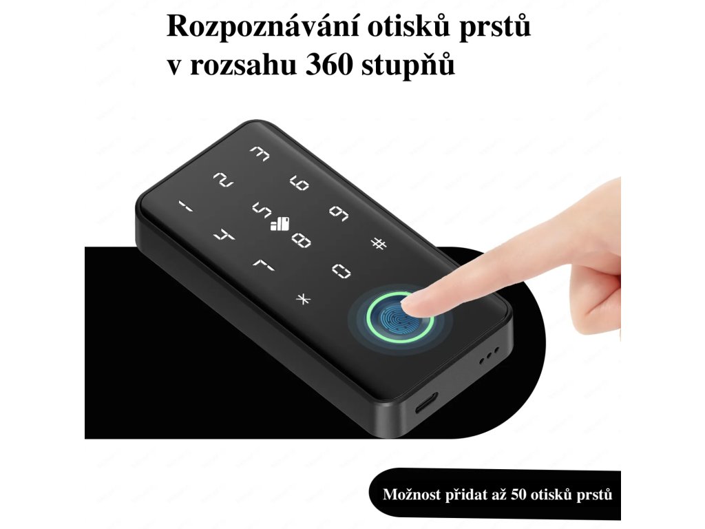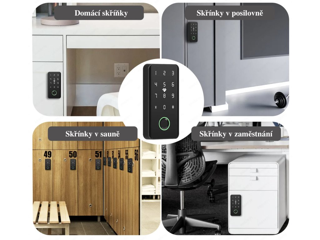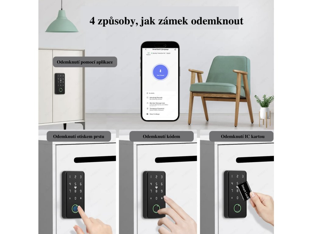 - Čtyři způsoby odemykání – PIN kód, otisk prstu (s kapacitou až 50 otisků), IC karta a mobilní aplikace, které vám poskytnou flexibilitu a pohodlí.