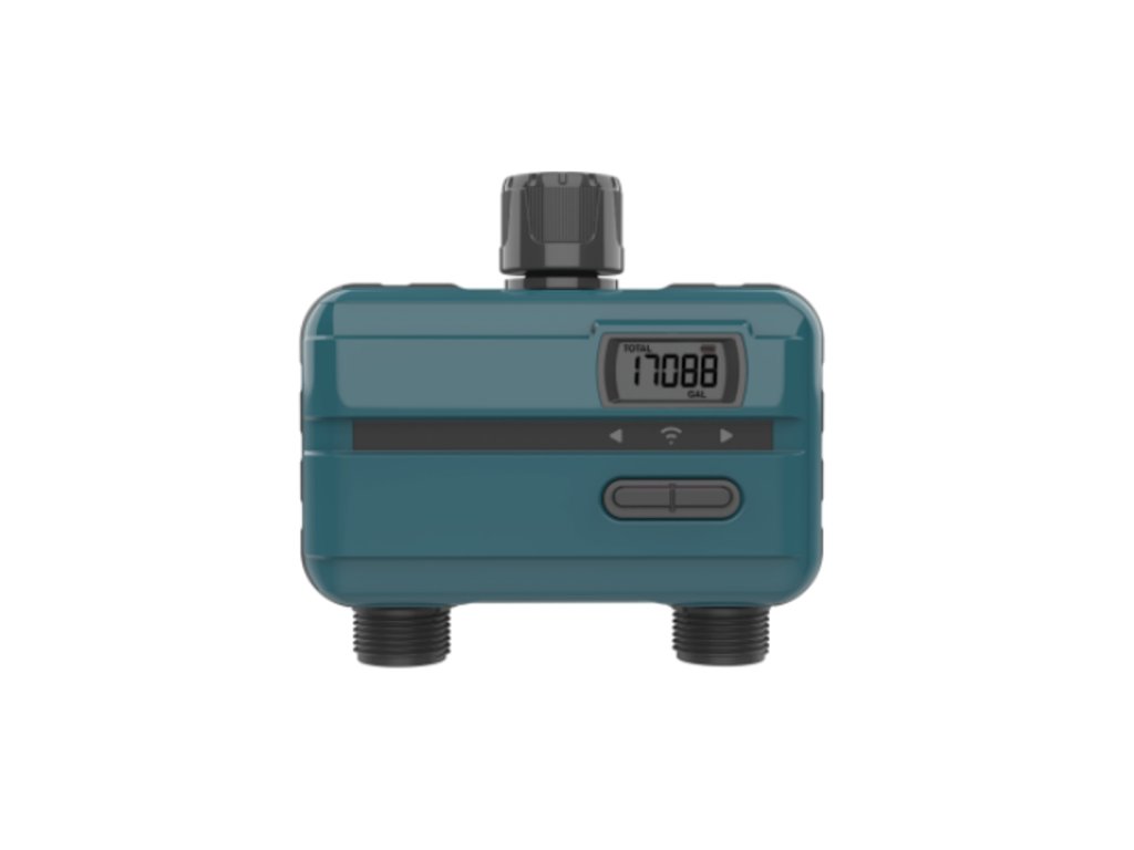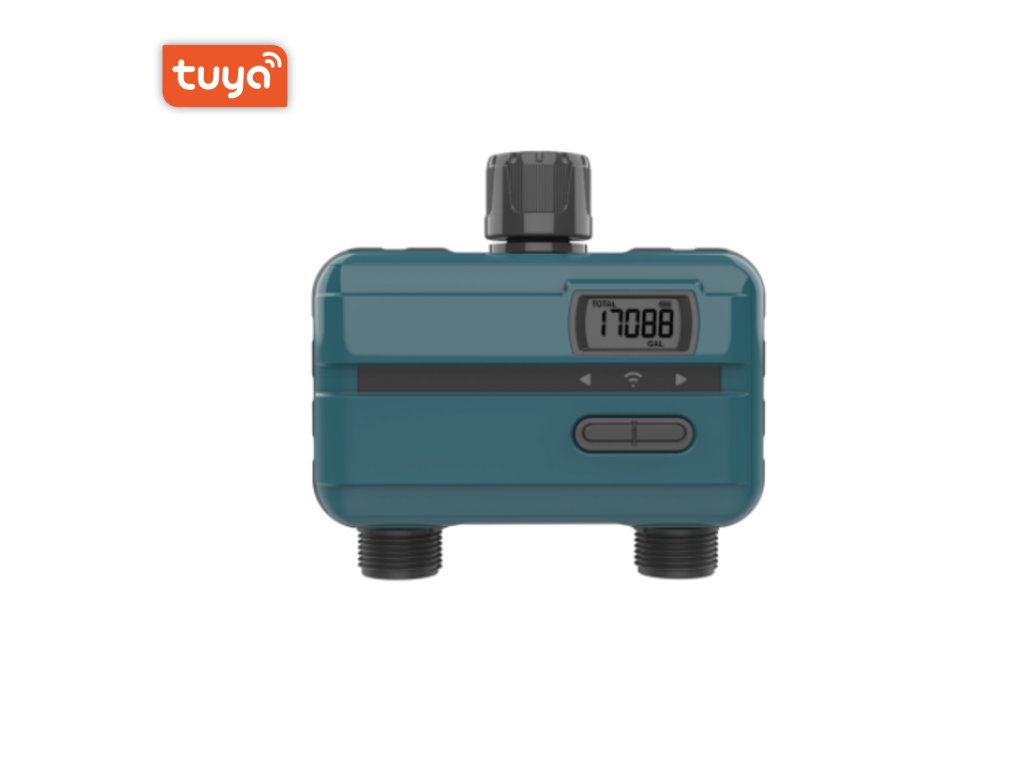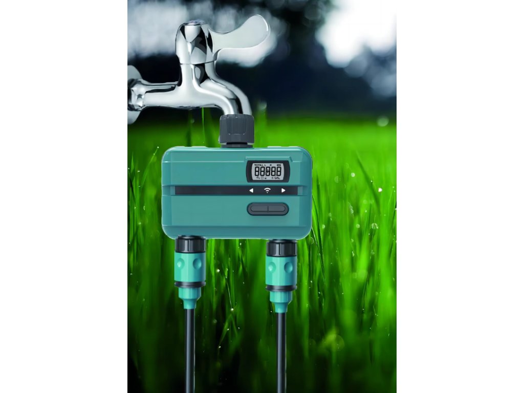 Chytrý regulační ventil na zahradní hadici s Bluetooth, 2-zónový, displej s měřičem průtoku, ovládání přes mobilní aplikaci Tuya na dálku, odložení zavlažování v případě deštivé předpovědi počasí, možnost programů a časovače, max přívod vody 35 l, kompatibilní s Goole Assistant and Alexa.