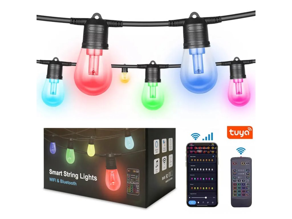 Zábavný LED řetěz (15 žárovek) ovládaný bezdrátově, RGBCW, příkon 12 W, WiFi, Bluetooth, Tuya Smart, dálkový ovladač, až 16 milionů barev, časovač, mění barvy podle hudby, nastavitelný jas a barvy, životnost 20 000 hodin, odolnost dle IP65, délka 15 metrů