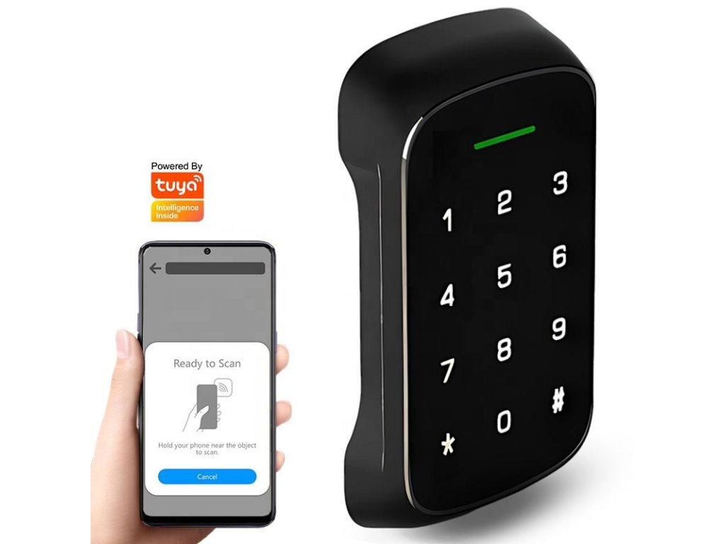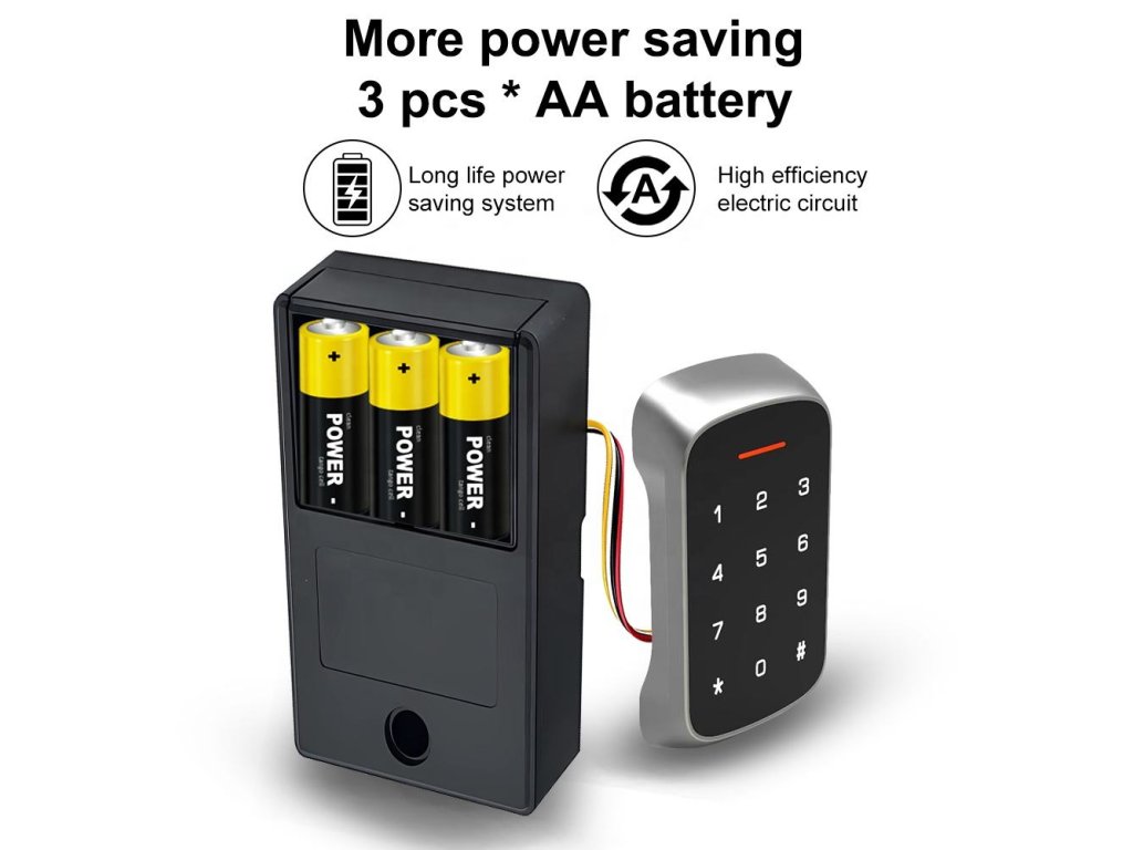 Chytrý zámek pro uzamykání nábytku, mobilní aplikace Tuya, Bluetooth, 4 způsoby odemykání (PIN, otisk prstu, IC karta, mobilním telefonem), napájení 4x AAA baterie, černé provedení.