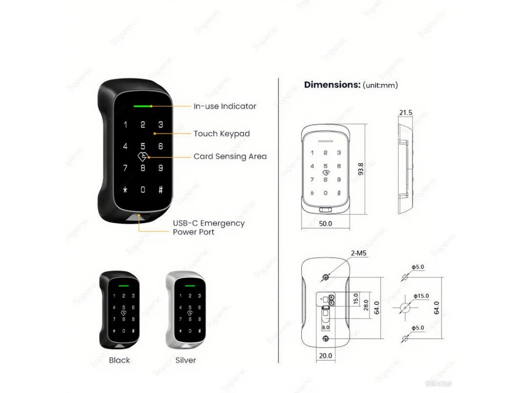 - Způsoby odemykání: PIN kód, otisk prstu (až 50), IC karta, mobilní aplikace