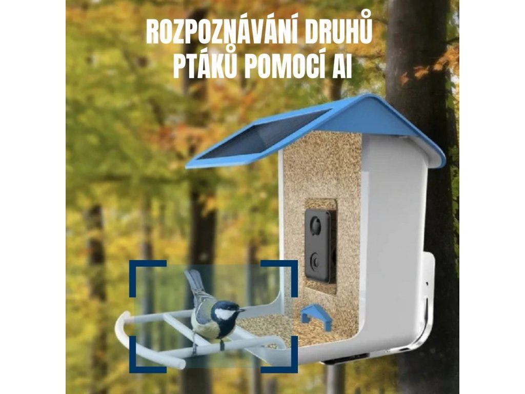 Chytré WiFi ptačí krmítko s vestavěnou kamerou se solárním dobíjením, automatické rozpoznávání druhu ptáků, bezdrátové provedení, mobilní aplikace Bird Lover / Tuya Smart, notifikace při detekci pohybu, přenos v reálném čase, záznam.