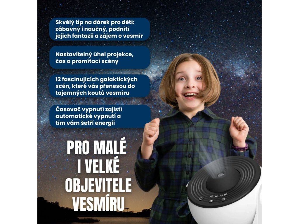 Projektor vesmírné oblohy s hvězdami a mlhovinou do dětského pokoje, na párty nebo třeba pro domácí kino, 12 scénářů zobrazení, napájení ze sítě, bílé provedení.
