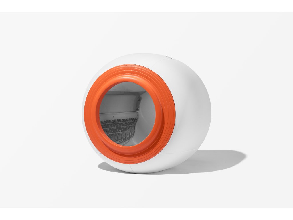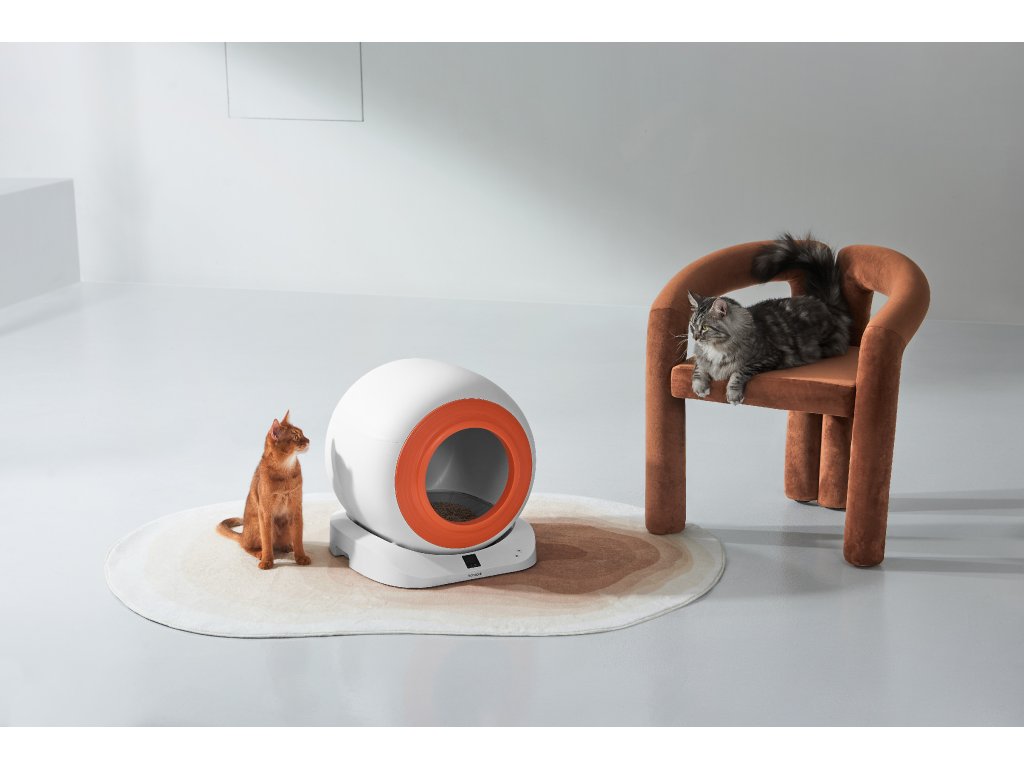 Samočistící toaleta pro kočky, WiFi 2,4 GHz, mobilní aplikace Tuya Smart/Smartlife, rozměry 48 x 52 x 50,5 cm, napájení ze sítě, objem toalety 65 litrů, bílo-oranžové provedení.
