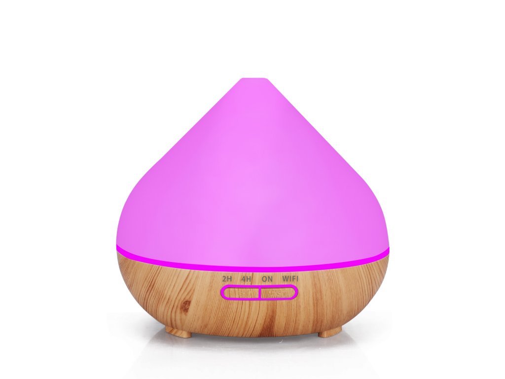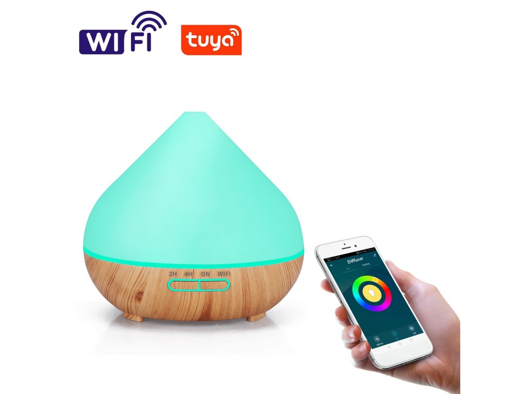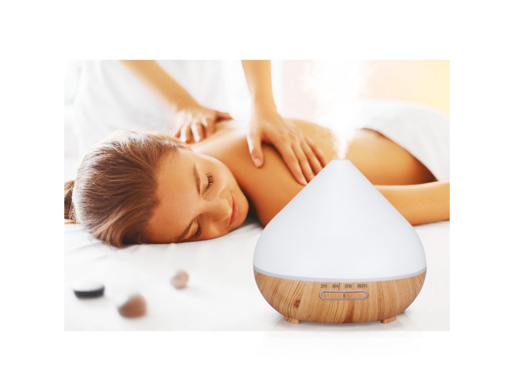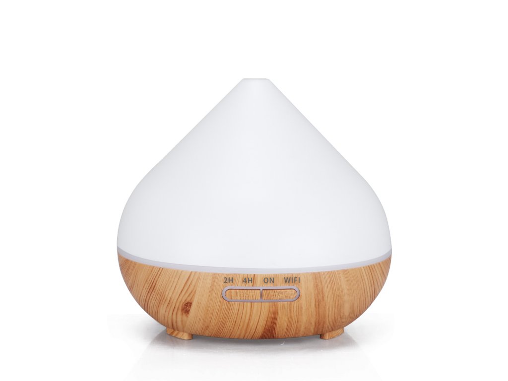 Chytrý aroma difuzér, objem nádoby 400 ml, 7 barev podsvícení, doba provozu 12 hodin, WIFI, podsvícení a časování vypnutí a zapnutí, barva bílá a světle hnědé dřevo