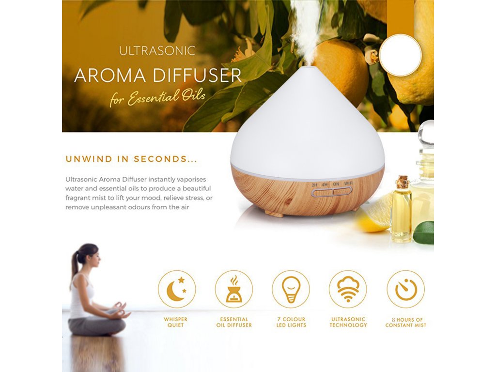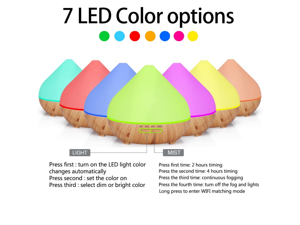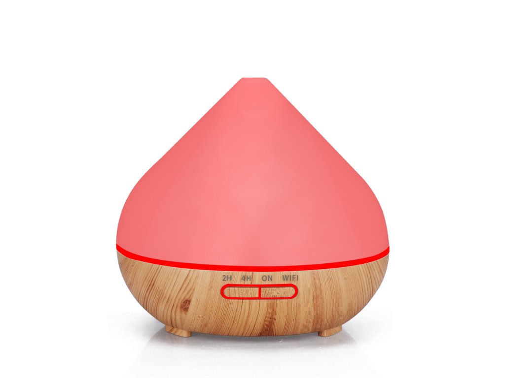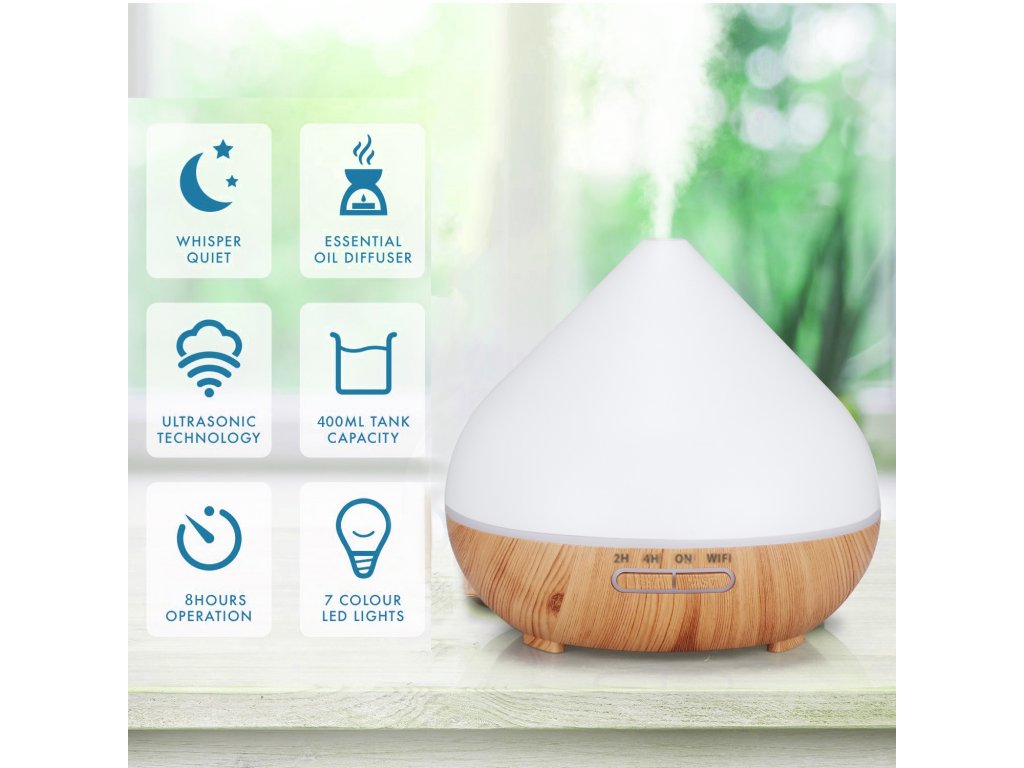 Chytrý aroma difuzér, objem nádoby 400 ml, 7 barev podsvícení, doba provozu 12 hodin, WIFI, podsvícení a časování vypnutí a zapnutí, barva bílá a světle hnědé dřevo