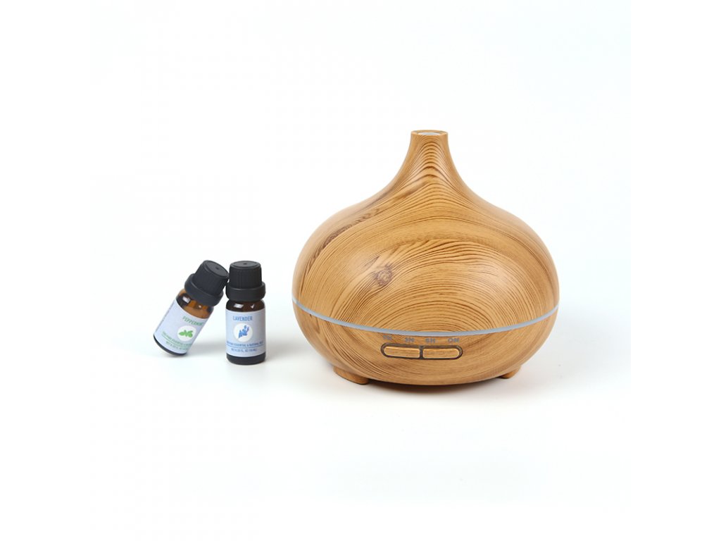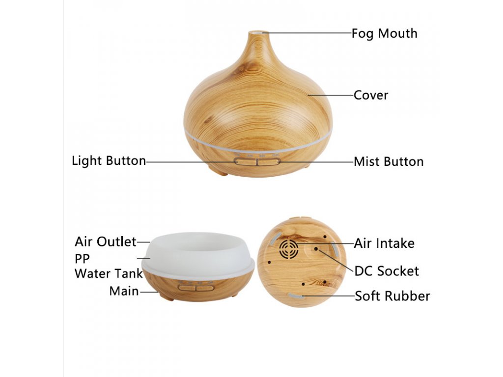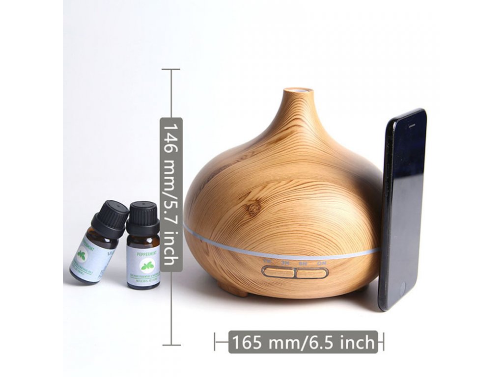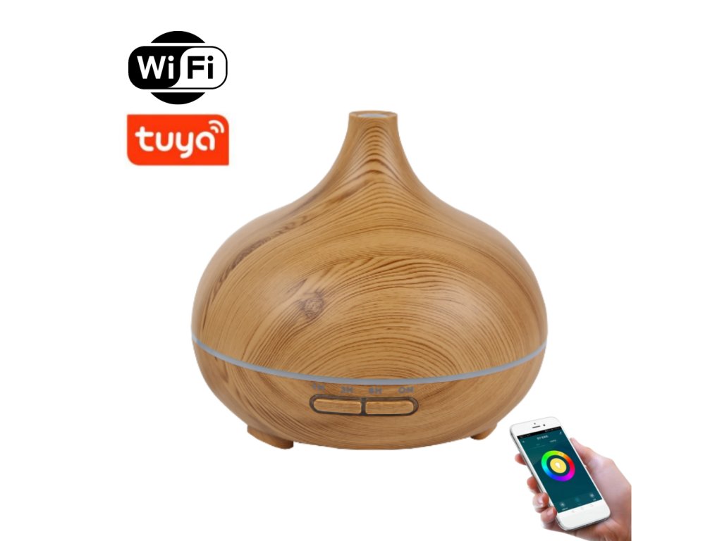 Chytrý aroma difuzér, objem nádoby 300 ml, 7 barev podsvícení, doba provozu až 15 hodin, WiFi, podsvícení a časování vypnutí a zapnutí, barva světle hnědé dřevo