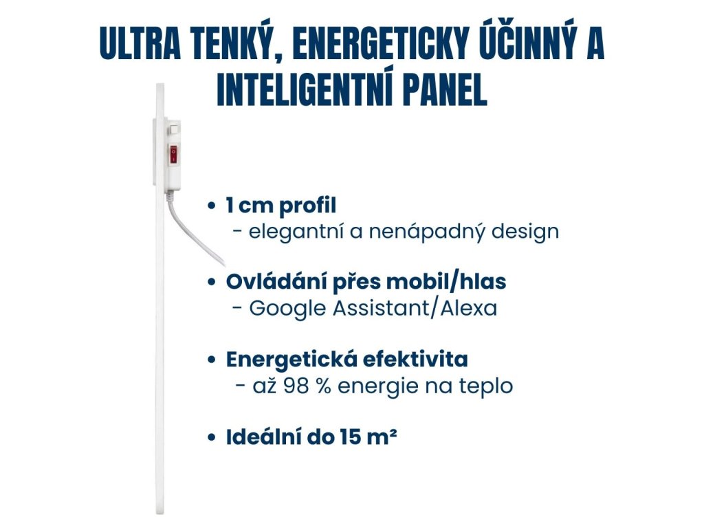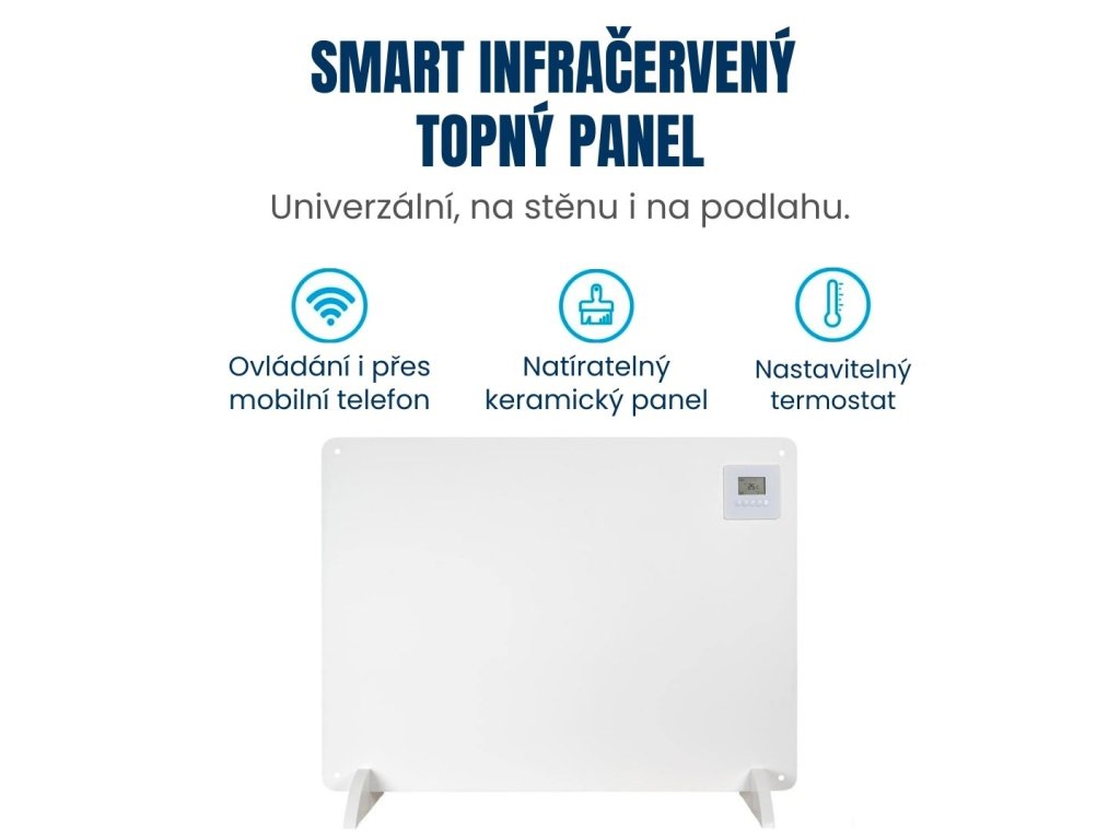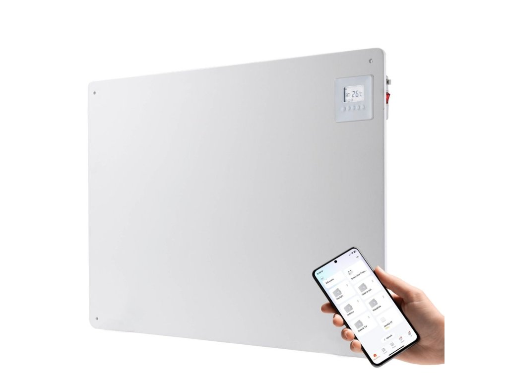 Infračervený topný panel, výkon 550 W, WiFi, mobilní aplikace Tuya Smart nebo Smart Life, k umístění na podlahu i na stěnu, bezpečnostní pojistka proti přehřátí, barva bílá.