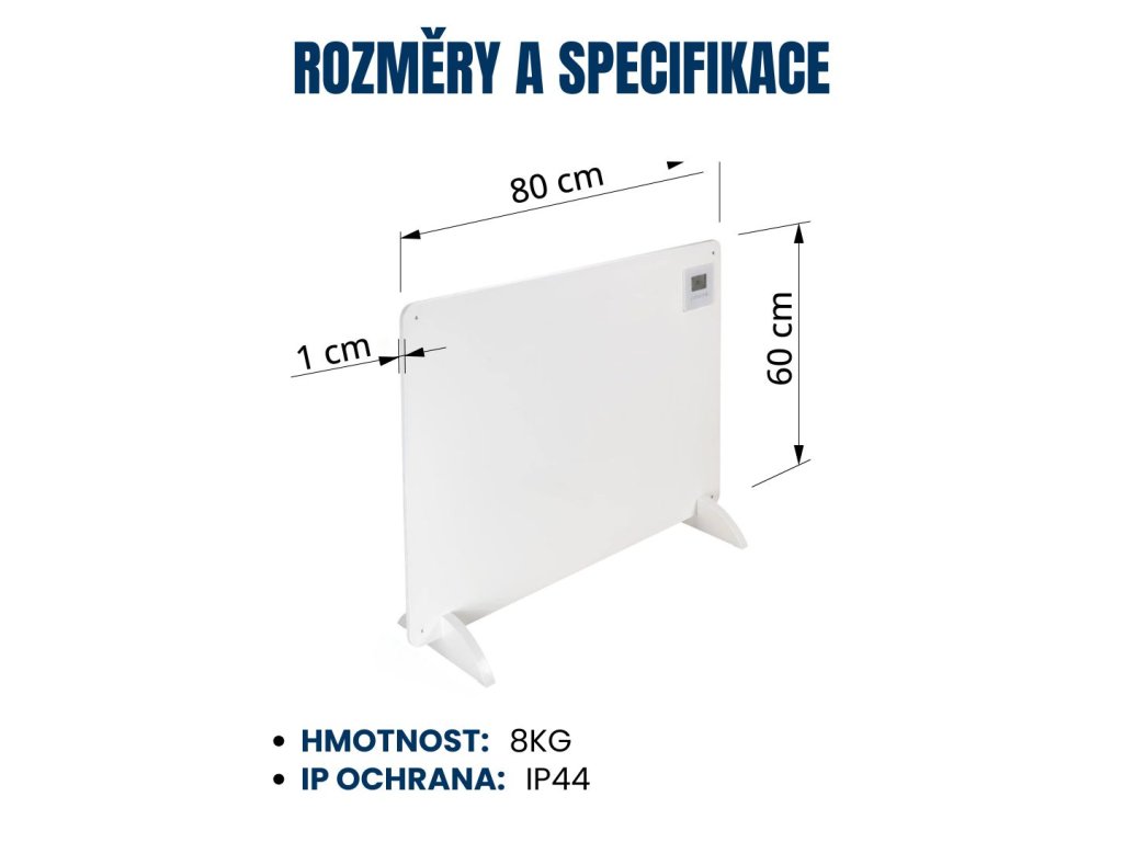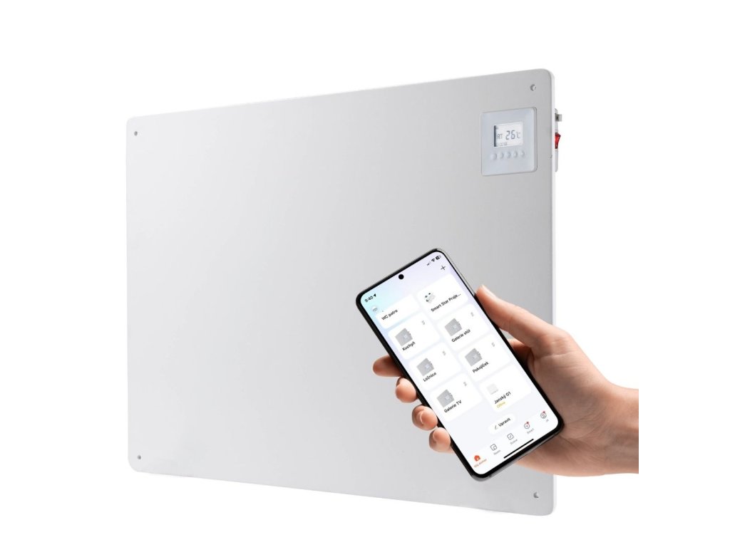 Infračervený topný panel, výkon 550 W, WiFi, mobilní aplikace Tuya Smart nebo Smart Life, k umístění na podlahu, na stěnu i na strop, bezpečnostní pojistka proti přehřátí, barva bílá.