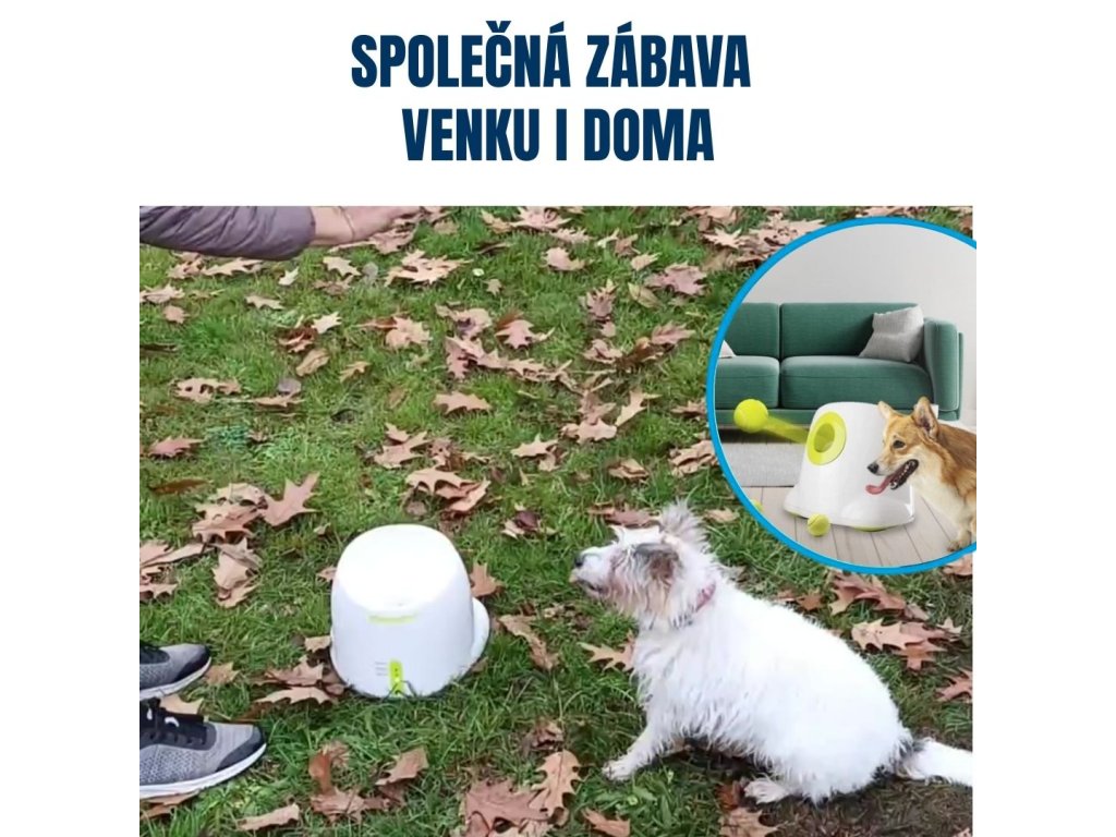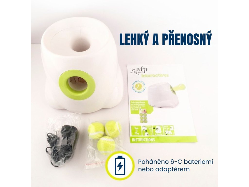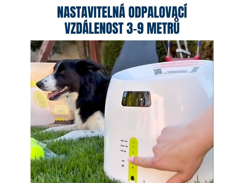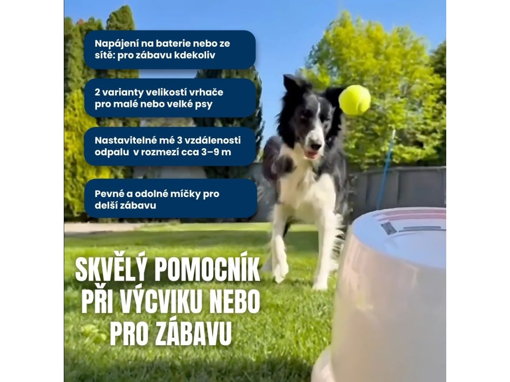 Vrhač míčků pro psy, dvě varianty - malé míčky (průměr 5 cm) a standardní tenisové míčky (průměr 6,5 cm), malý je vhodný pro menší a středně velká plemena psů a velký je vhodný pro větší plemena psů, materiál: plast, nastavení vzdálenosti hodu, napájení ze sítě i na baterie, 3 míčky v balení