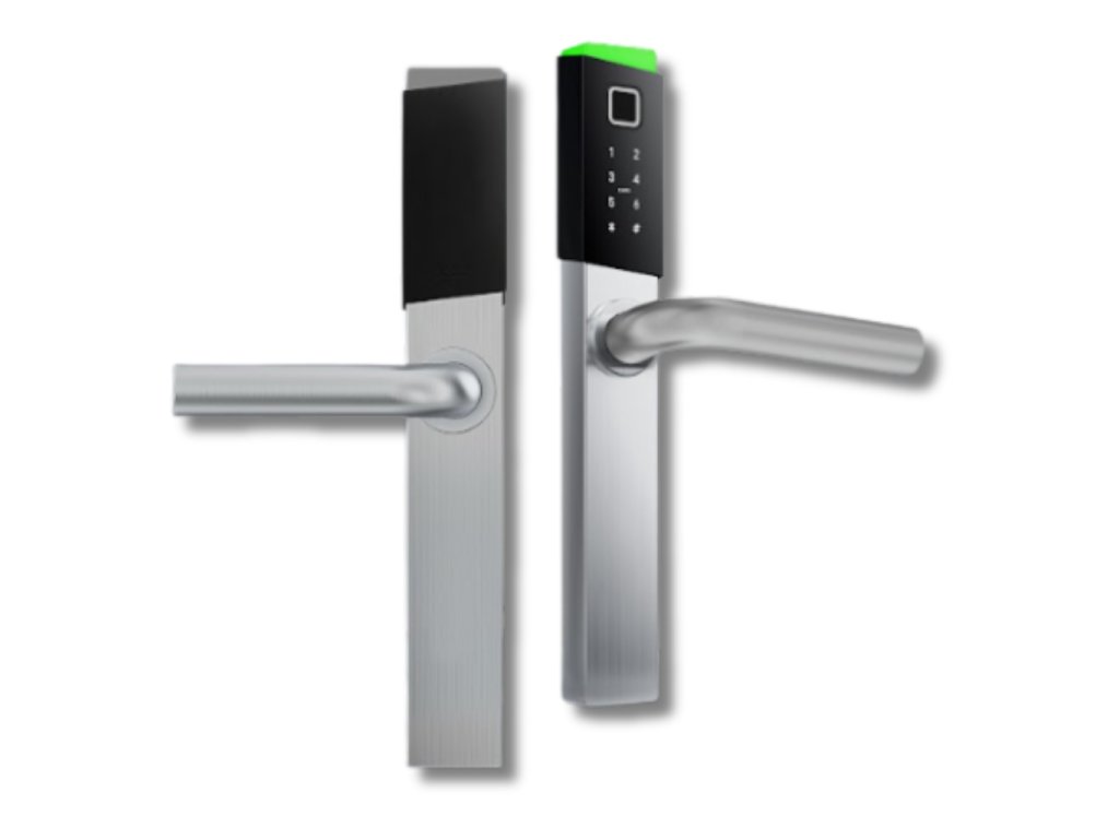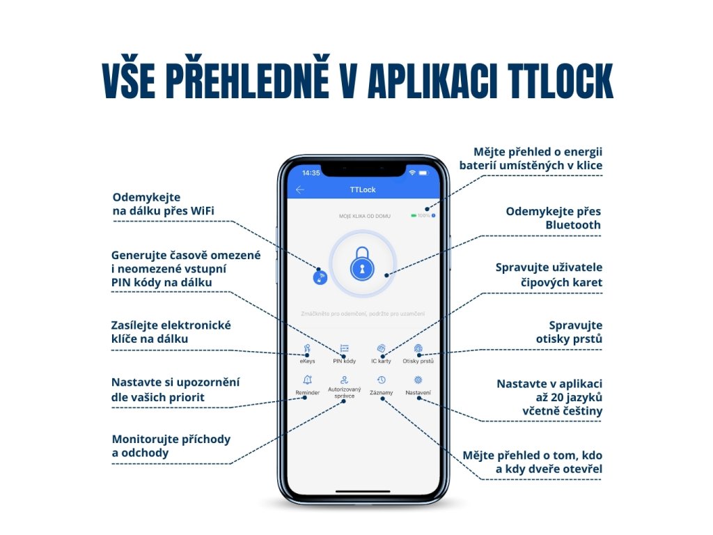 - Více způsobů odemykání – otisk prstu, PIN kód, čipová karta nebo mobilní telefon – pro maximální bezpečnost a flexibilitu