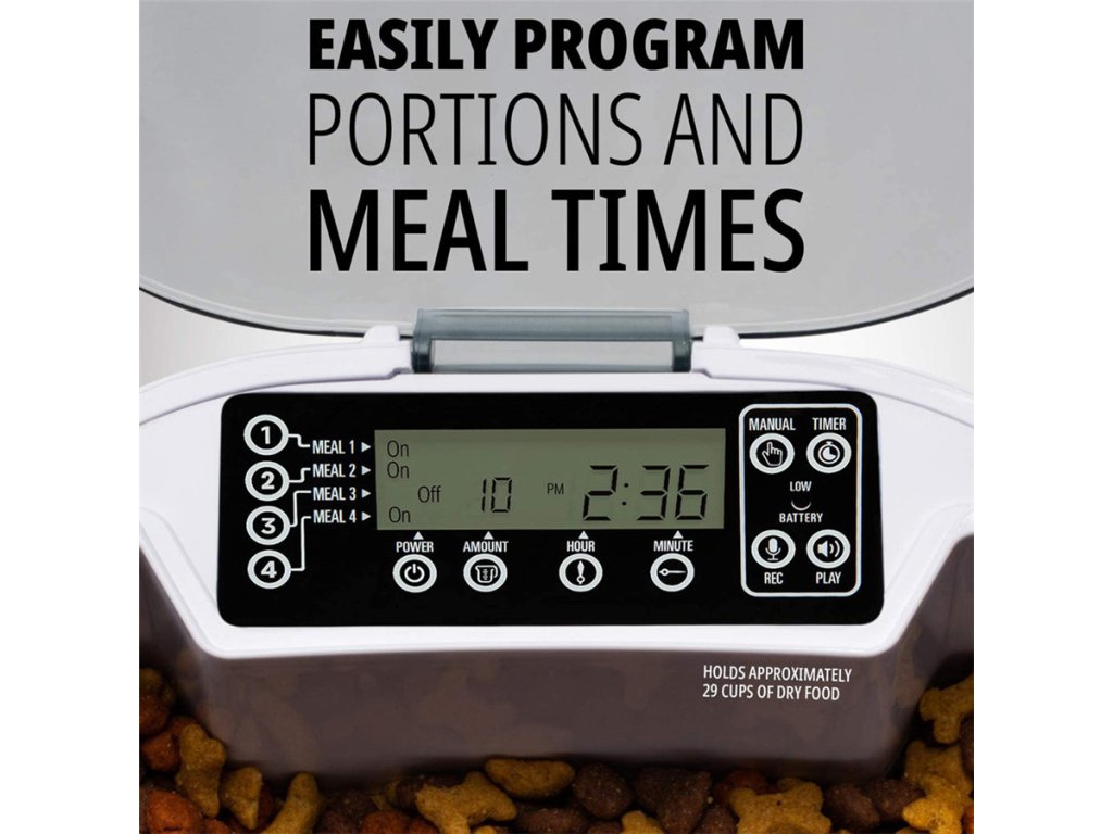 Tlačítky ovládaný a programovaný dávkovač krmiva pro optimální porci krmiva pro psy a kočky, krmení i bez vaší účasti, objem 6 l, 2 rotory pro optimální velikost porce, zvuková nahrávka, pouze pro suché krmivo, barva bílá