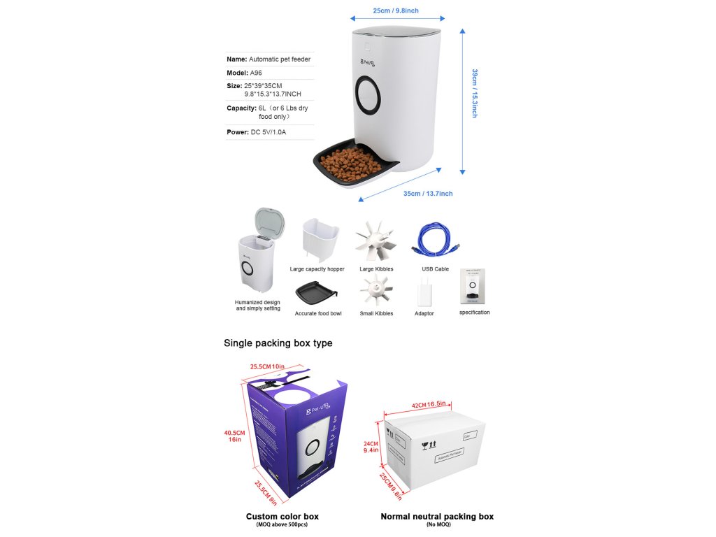 Zdrželi jste se v práci a nestíháte se domů vrátit a nakrmit Vašeho mazlíčka? Zapomněli jste připravit krmení, zatímco jste na služební cestě? Všechny tyto situace můžete předcházet pořízením si inteligentního dávkovače krmiva pro psy i kočky. Pomocí tlačítek a displeje nastavíte jednoduše plánované krmení, tj. objem, čas i datum, včetně opakování. Nastavte si libovolné intervaly i množství krmiva ideálně tak, aby se váš pejsek nebo kočička nepřejídali: dlouhodobě tím prospějete jejich kondici. V době svojí nepřítomnosti můžete také nahrát krátkou 10 vteřinovou zprávu, kterou upozorníte mazlíčka na čas krmení vzdáleně. Krmítko disponuje lehce vyjmutelnou miskou a zásobníkem na žrádlo, které vám umožní snadné vyčištění. Navíc pomocí dvou rotorů můžete přizpůsobit velikosti jednotlivých porcí potřebám a velikosti vašeho mazlíčka !