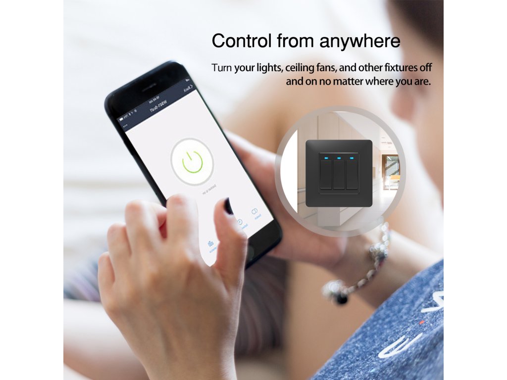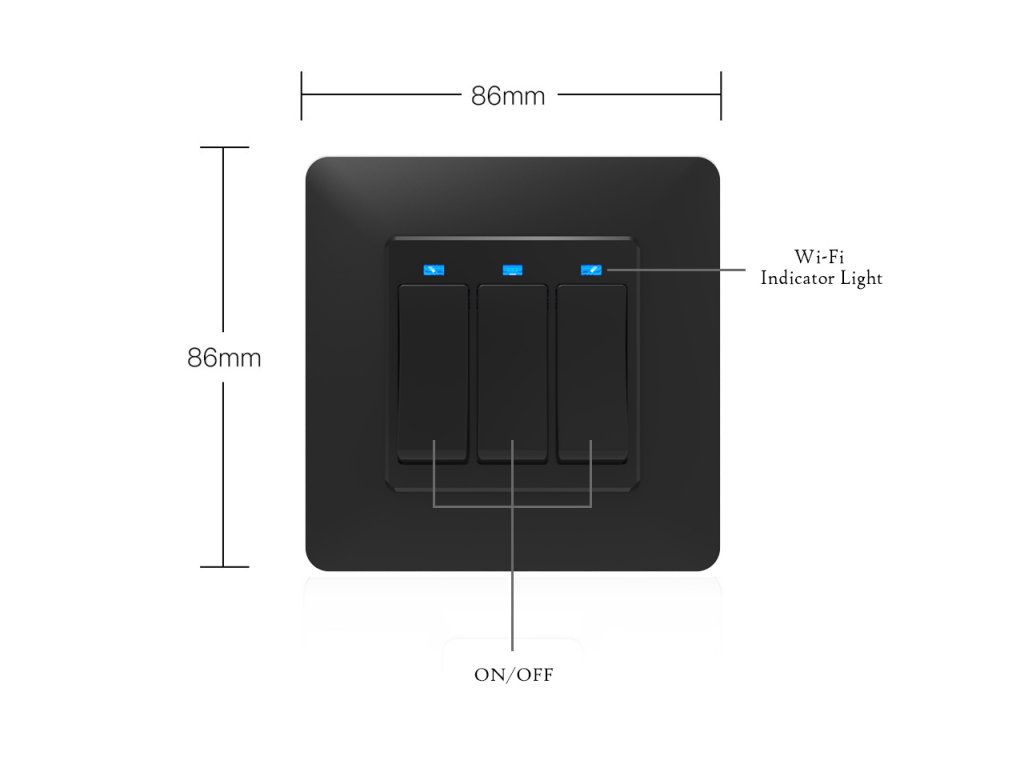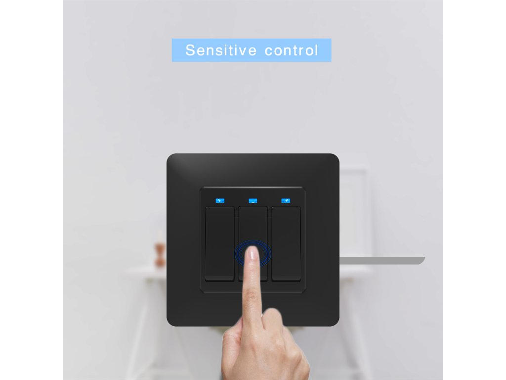 WIFI vypínač pro osvětlení a elektroinstalaci, tři tlačítka, připojení přes WIFI, napájení ze sítě, kompatibilní s Google Assistant a Amazon Alexa, aplikace pro Android/iOS Tuya Smart Life, barva černá