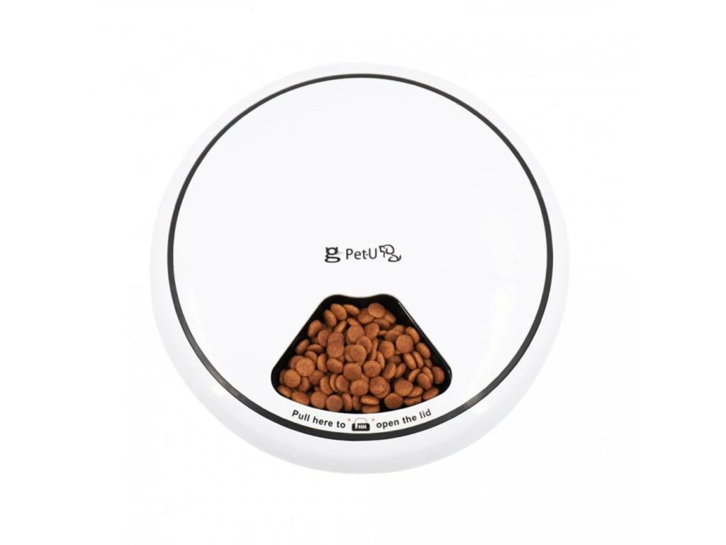 Automatický dávkovač krmiva obsahující 5 misek s možností náplně nejen suchými jídly, 10 s hlasová zpráva, celková kapacita 1,6 l, barva bílá