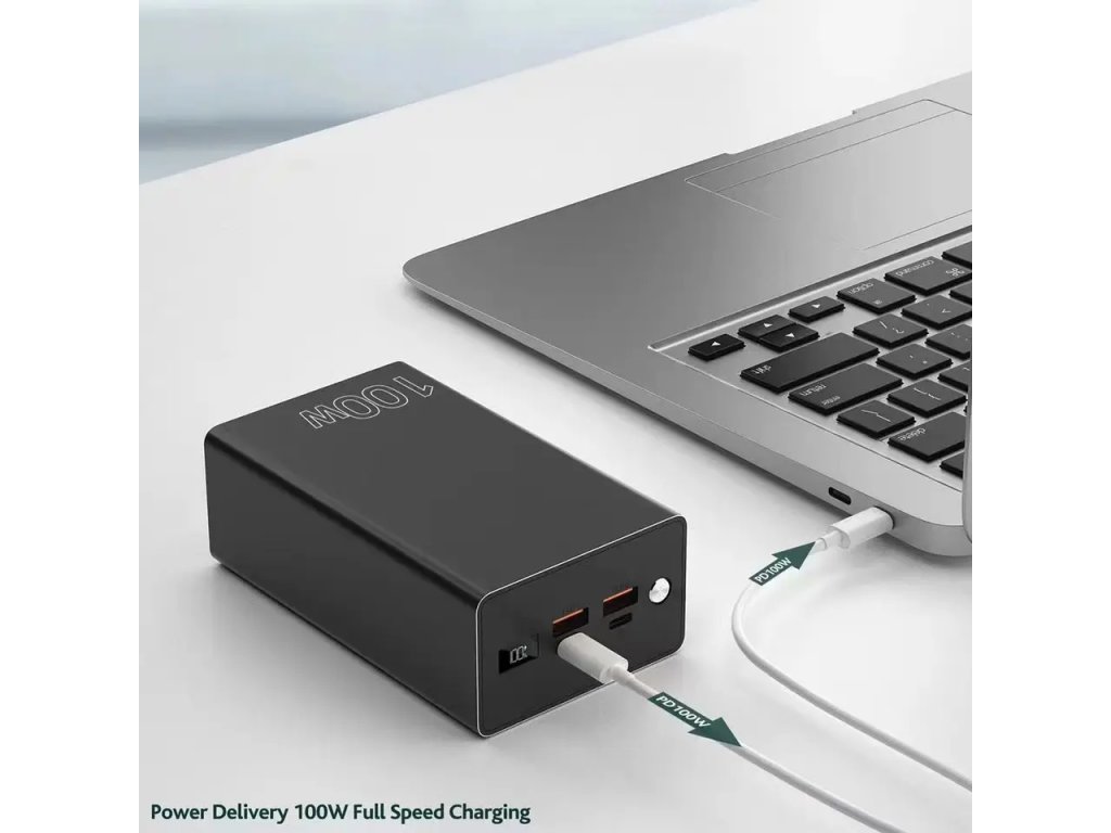 Velkokapacitní powerbanka vhodná pro nabíjení mobilních telefonů, tabletů a notebooků, kapacita 50 000 mAh, rychlé nabíjení PD 100W, 2 x USB a 2x USB-C, kvalitní lithium-polymerové baterie, certifikace: FCC, CE, Rohs, LED displej, ochrana proti nadměrnému vybíjení, ochranu proti zkratu, přebíjení a kolísání nízkého napětí, barva: černá